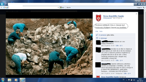 To this day Serb nationalist websites and on Facebook and other social media outlets continue to spread revisionist myths half-truths and flat out lies about the genocide. The picture below is from a Serb nationalist Facebook page “Borac Republike Srpske” according to the writings below the picture the bodies in the mass grave are Serbs killed by Bosniacs then dumped on garbage site. In reality its a picture of mass grave taken in 1996 at the Pilica Farm, one of the execution-sites during the massacre of up to 8000 men and boys from Srebrenica. What makes this particular episode even more disturbing is that specific picture is probably the most recognizable of all pictures taken from mass graves in and around Srebrenica.