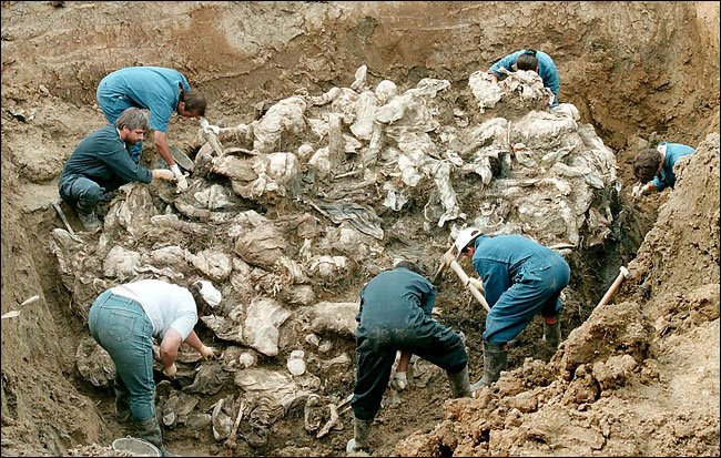 PHOTO: Forensic experts in 1996 working in a Srebrenica Genocide mass grave in the village of Pilica.